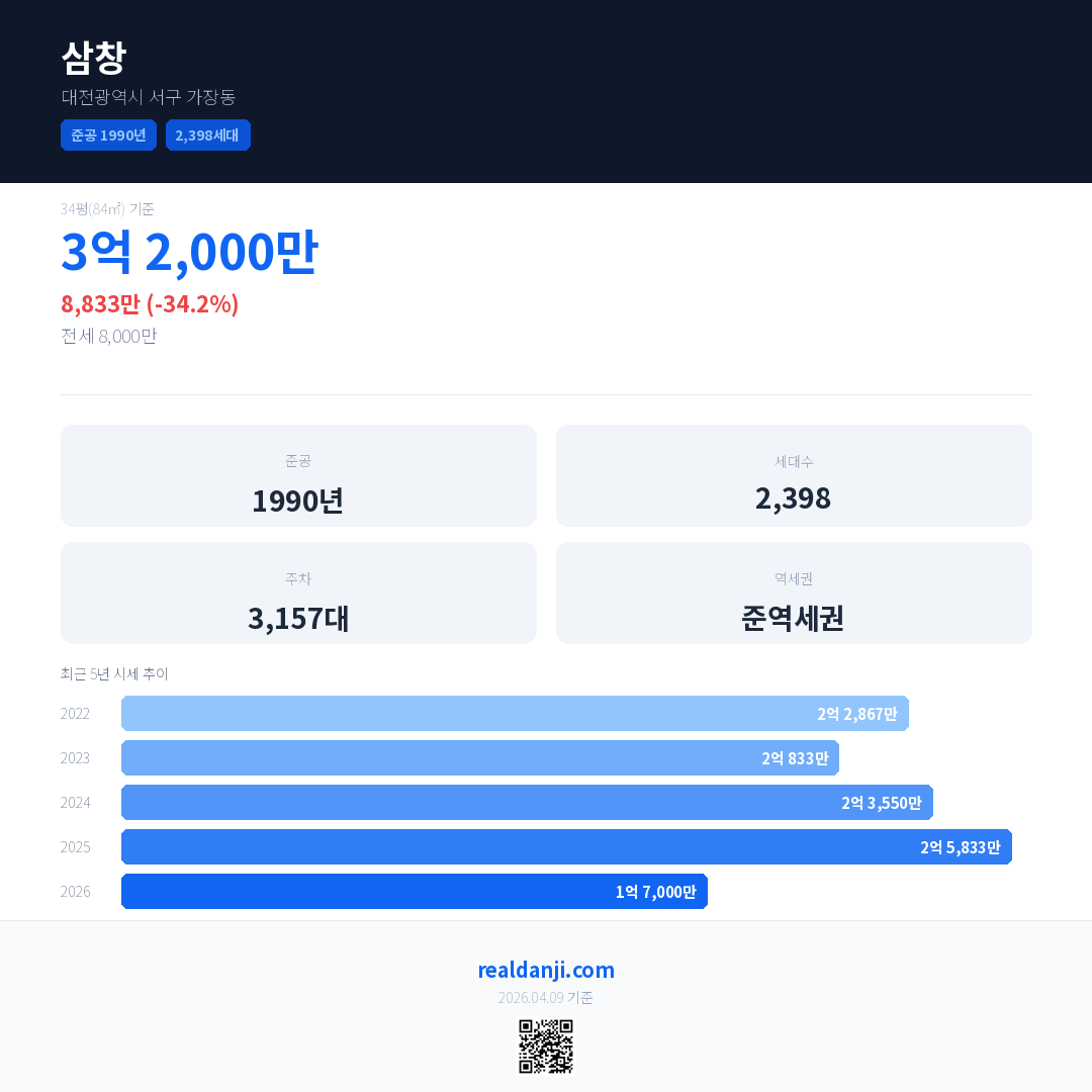 삼창 국민평형 기준 2026년 평균 거래가는 1억 7,000만으로, 전년 대비 34.2% 하락 했습니다.