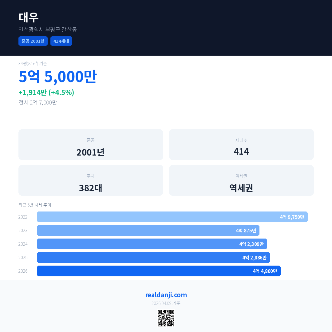 대우 국민평형 기준 2026년 평균 거래가는 4억 4,800만으로, 전년 대비 4.5% 상승 했습니다.