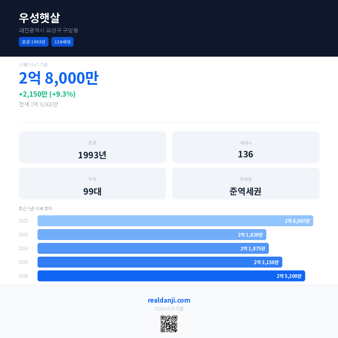 우성햇살 국민평형 기준 2026년 평균 거래가는 2억 5,300만으로, 전년 대비 9.3% 상승 했습니다.