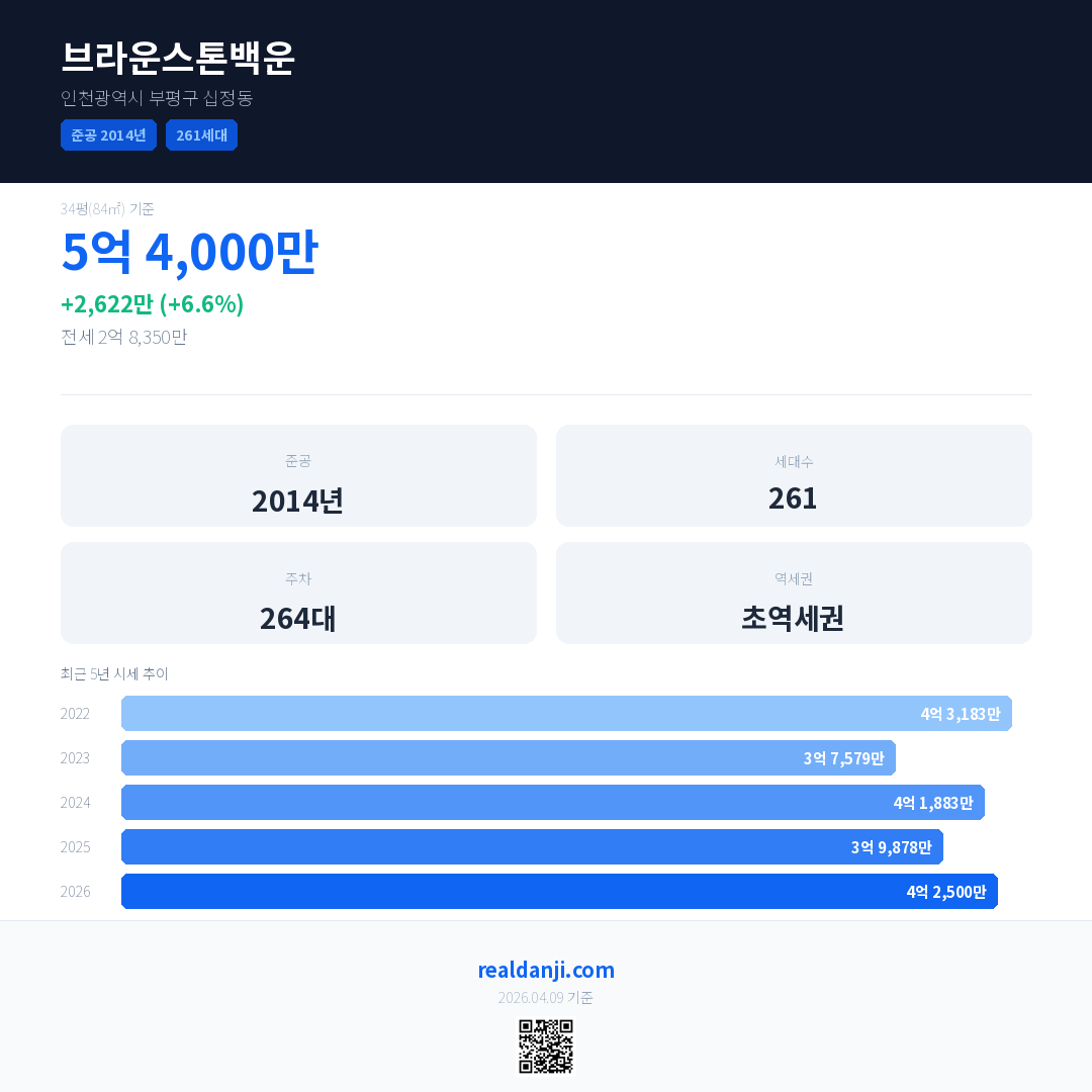 브라운스톤백운 국민평형 기준 2026년 평균 거래가는 4억 2,500만으로, 전년 대비 6.6% 상승 했습니다.