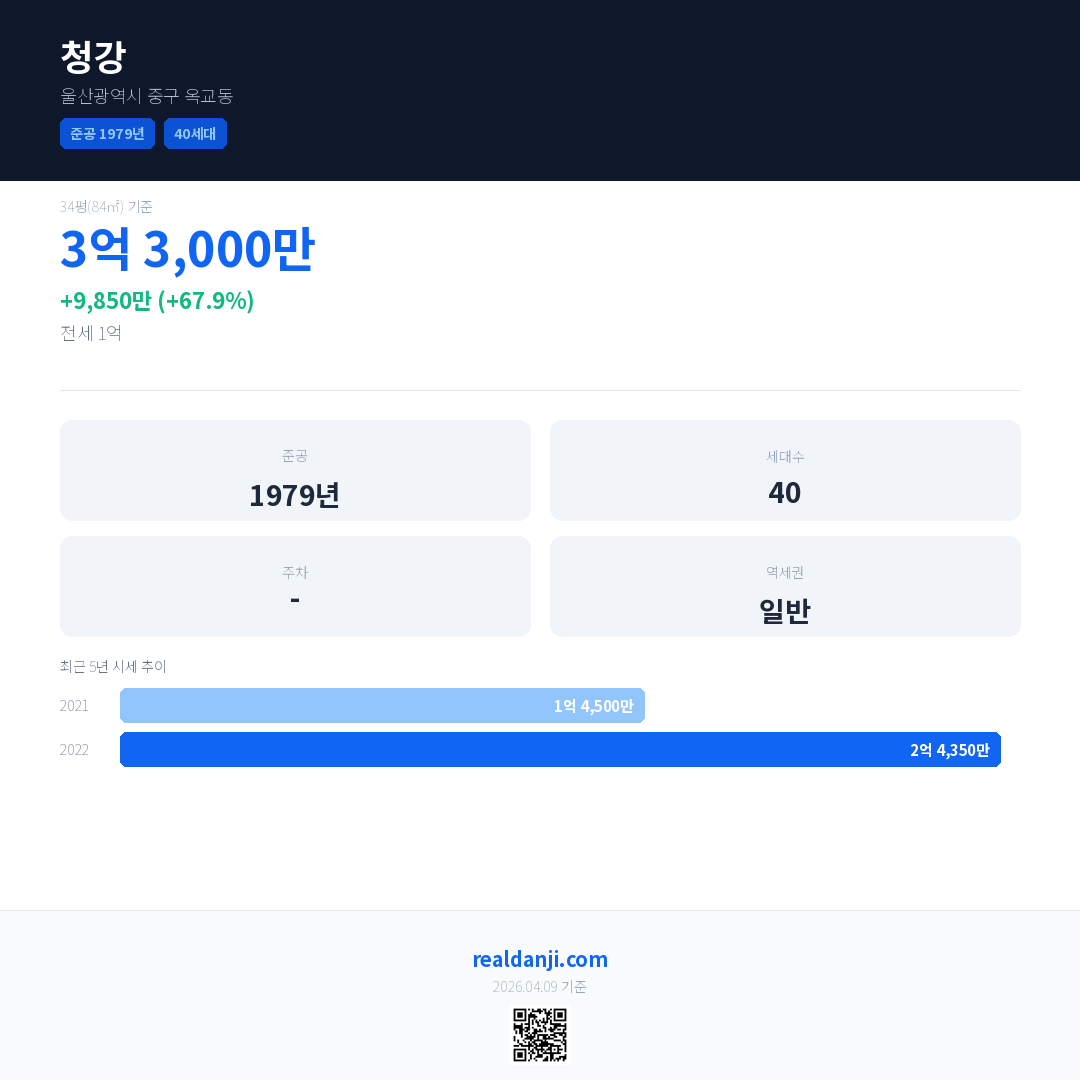 청강 국민평형 기준 2022년 평균 거래가는 2억 4,350만으로, 전년 대비 67.9% 상승 했습니다.