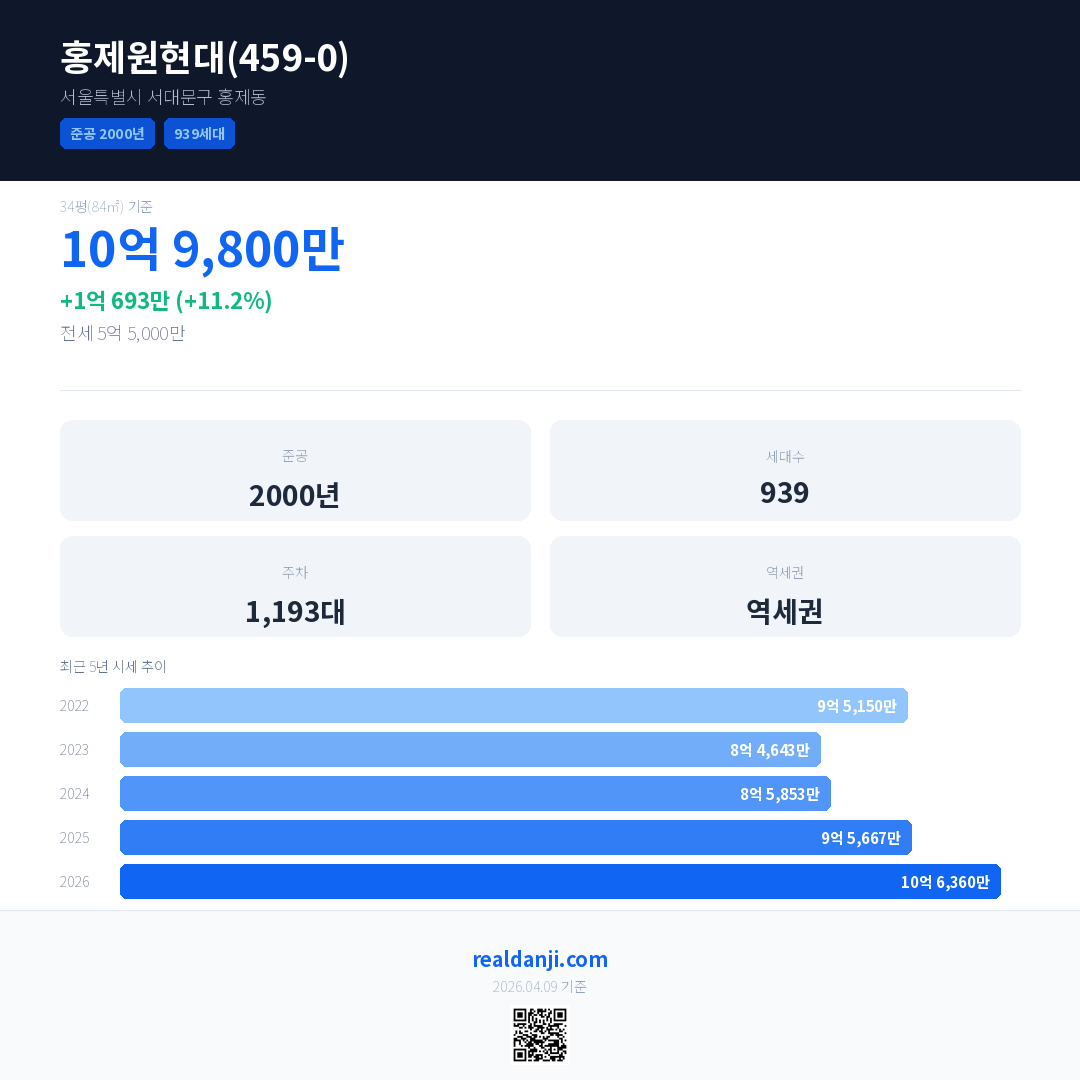 홍제원현대(459-0) 국민평형 기준 2026년 평균 거래가는 10억 6,360만으로, 전년 대비 11.2% 상승 했습니다.