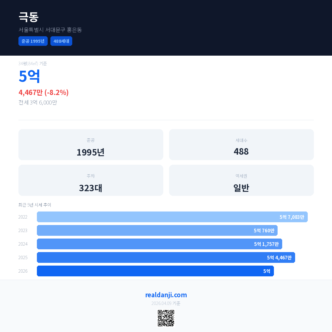 극동 국민평형 기준 2026년 평균 거래가는 5억으로, 전년 대비 8.2% 하락 했습니다.