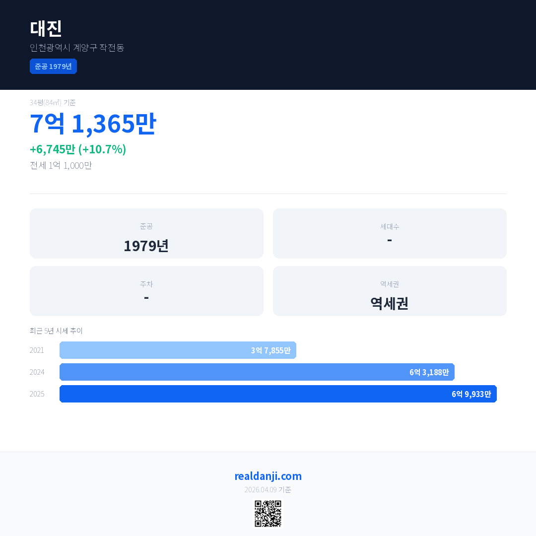 대진 국민평형 기준 2025년 평균 거래가는 6억 9,933만으로, 전년 대비 10.7% 상승 했습니다.
