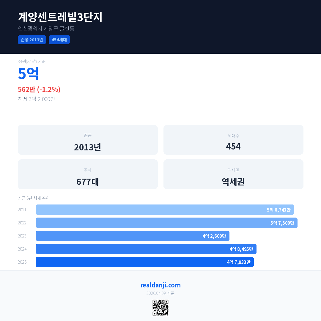 계양센트레빌3단지 국민평형 기준 2025년 평균 거래가는 4억 7,933만으로, 전년 대비 1.2% 하락 했습니다.