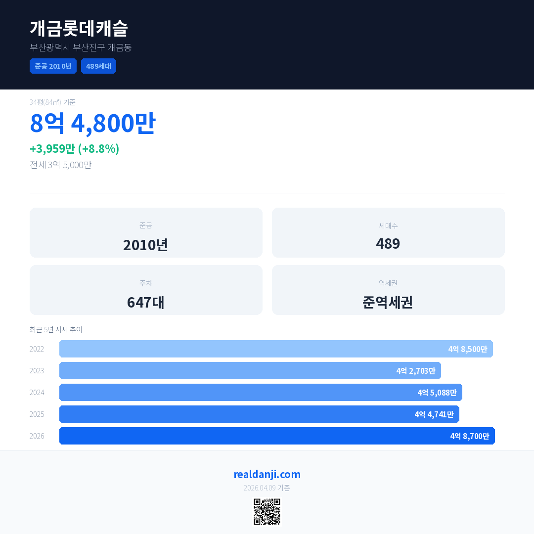 개금롯데캐슬 국민평형 기준 2026년 평균 거래가는 4억 8,700만으로, 전년 대비 8.8% 상승 했습니다.