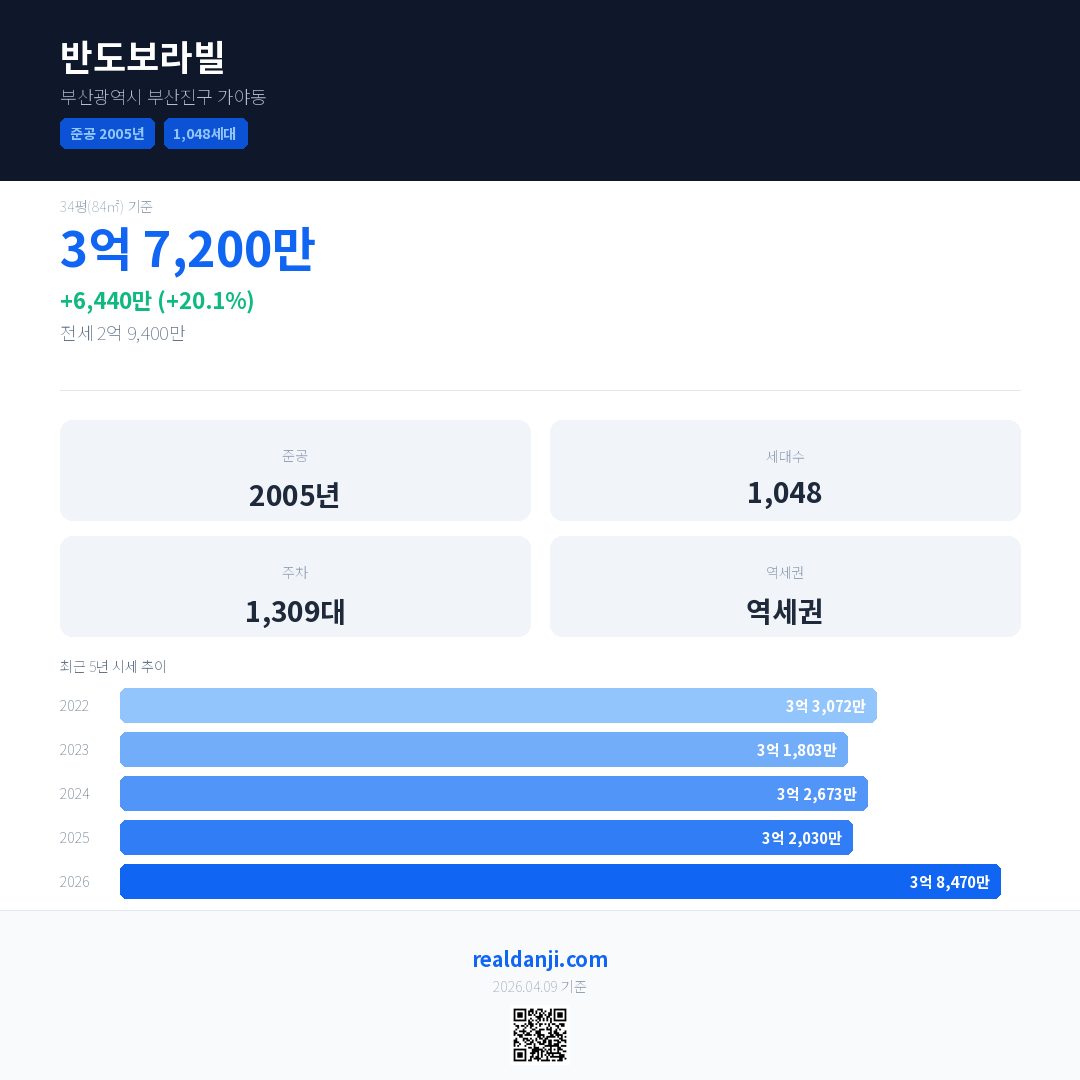 반도보라빌 국민평형 기준 2026년 평균 거래가는 3억 8,470만으로, 전년 대비 20.1% 상승 했습니다.
