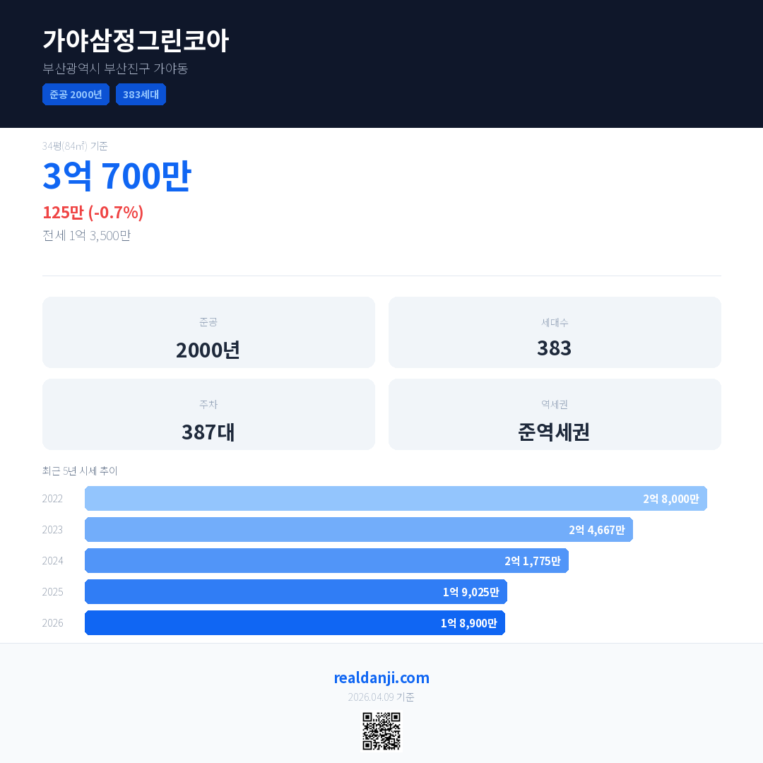 가야삼정그린코아 국민평형 기준 2026년 평균 거래가는 1억 8,900만으로, 전년 대비 0.7% 하락 했습니다.