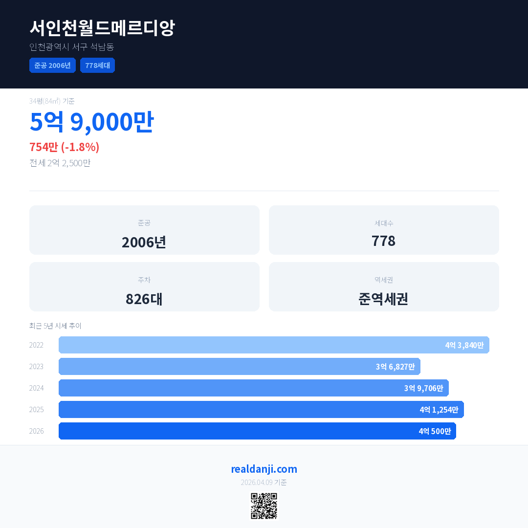 서인천월드메르디앙 최근 거래가는 5억 9,000만입니다. (2026-04)