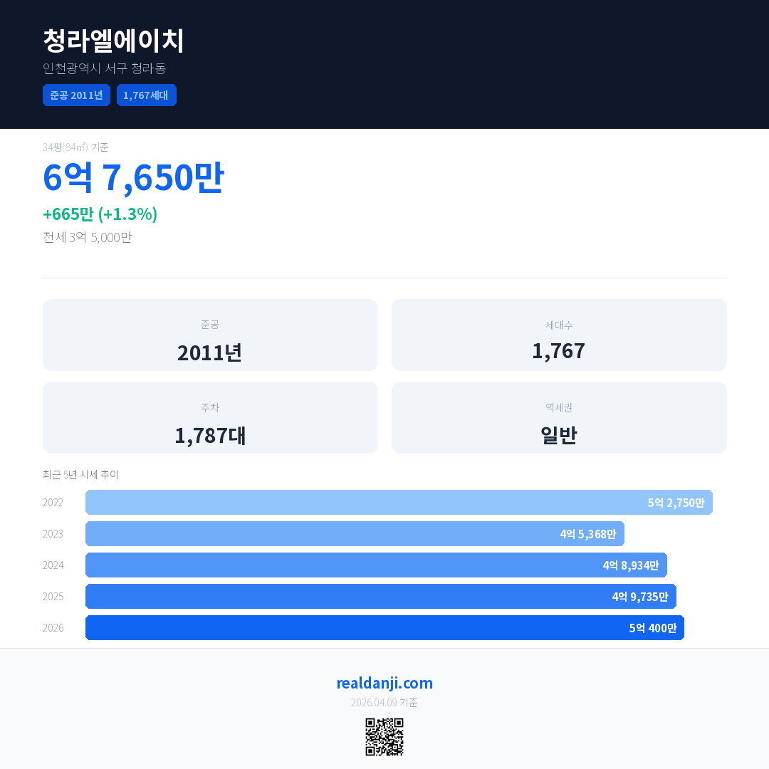 청라엘에이치 국민평형 기준 2026년 평균 거래가는 5억 400만으로, 전년 대비 1.3% 상승 했습니다.