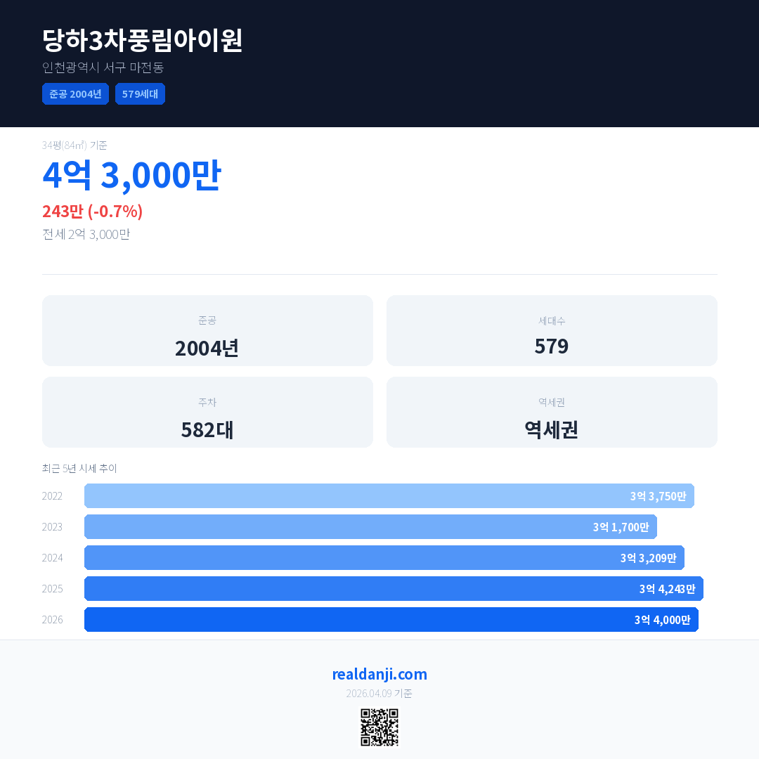 당하3차풍림아이원 최근 거래가는 4억 3,000만입니다. (2026-03)