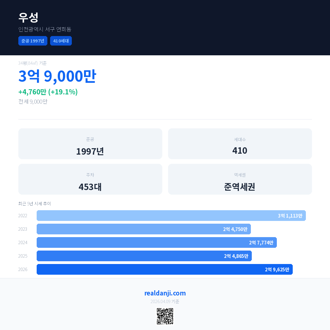 우성은(는) 1997년에 준공되었으며, 현재 29년차입니다. 총 410세대 규모입니다.