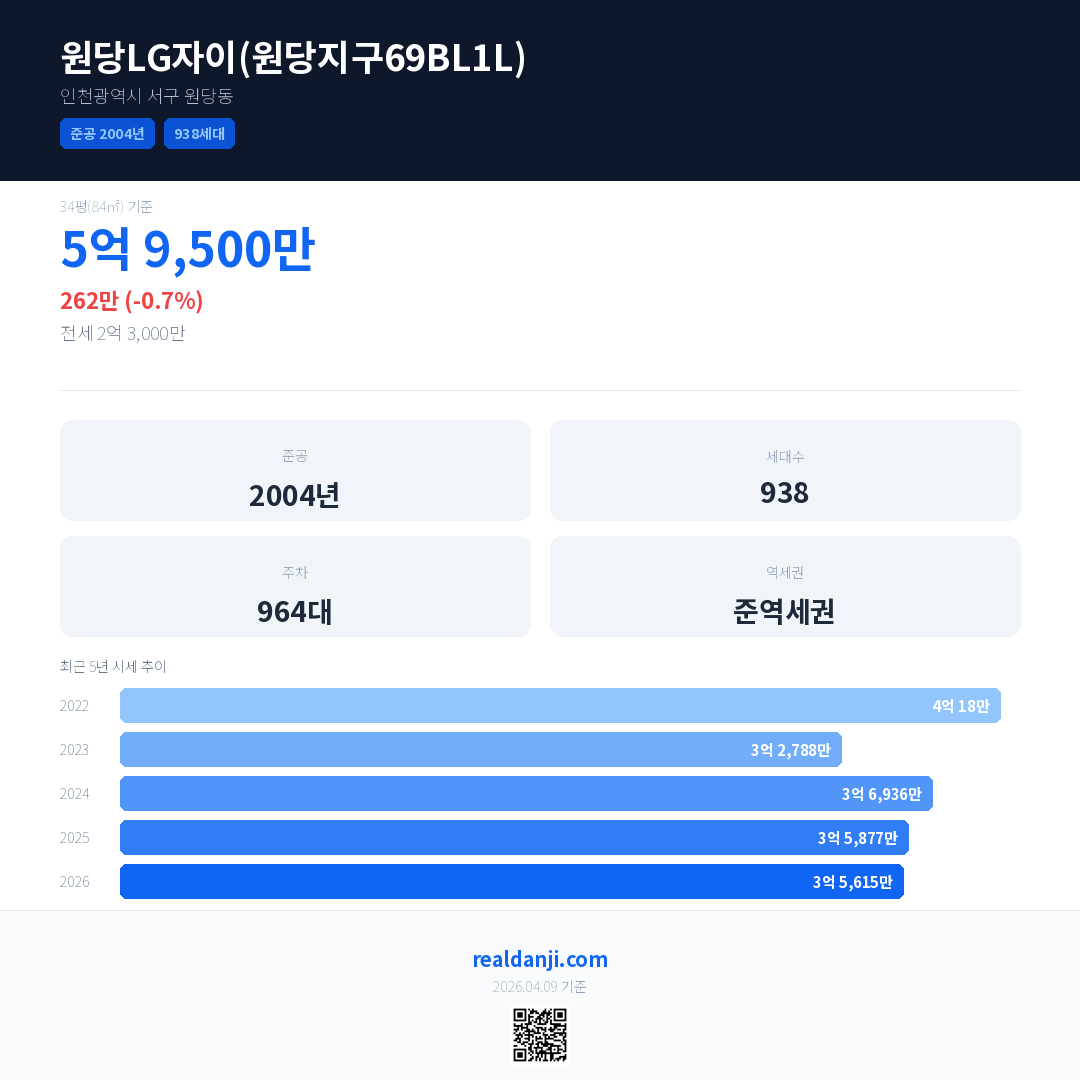 원당LG자이(원당지구69BL1L) 최근 거래가는 5억 9,500만입니다. (2026-04)
