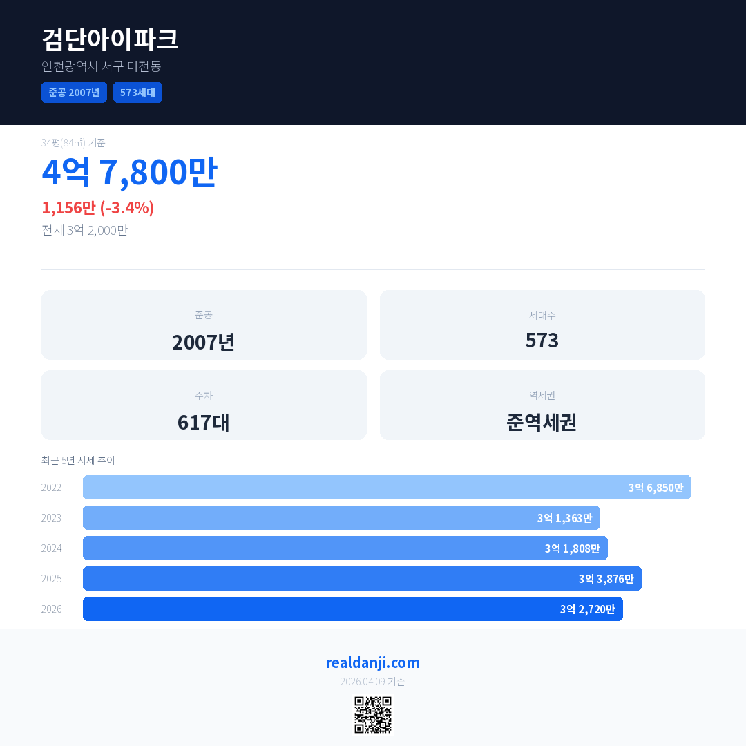 검단아이파크 최근 거래가는 4억 7,800만입니다. (2026-03)