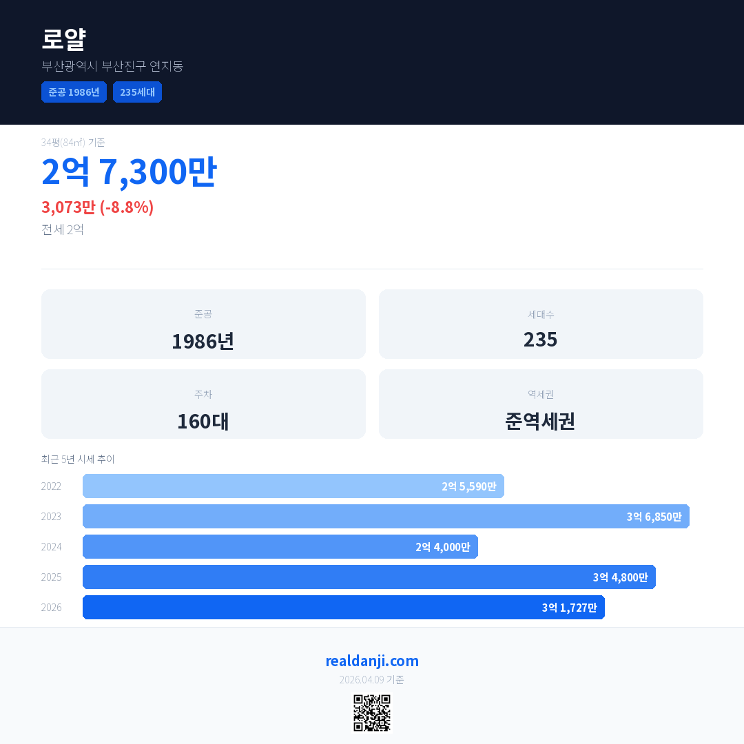 로얄은(는) 1986년에 준공되었으며, 현재 40년차입니다. 총 235세대 규모입니다.
