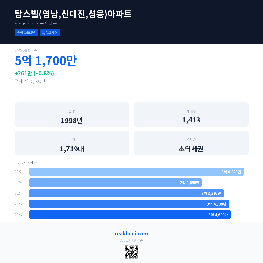 탑스빌(영남,신대진,성웅)아파트 최근 거래가는 5억 1,700만입니다. (2026-03)
