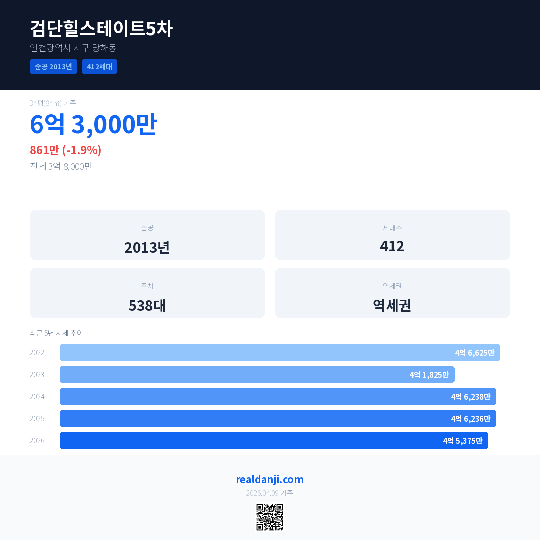 검단힐스테이트5차은(는) 2013년에 준공되었으며, 현재 13년차입니다. 총 412세대 규모입니다.