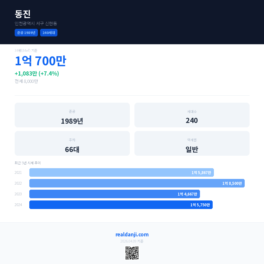 동진 국민평형 기준 2024년 평균 거래가는 1억 5,750만으로, 전년 대비 7.4% 상승 했습니다.