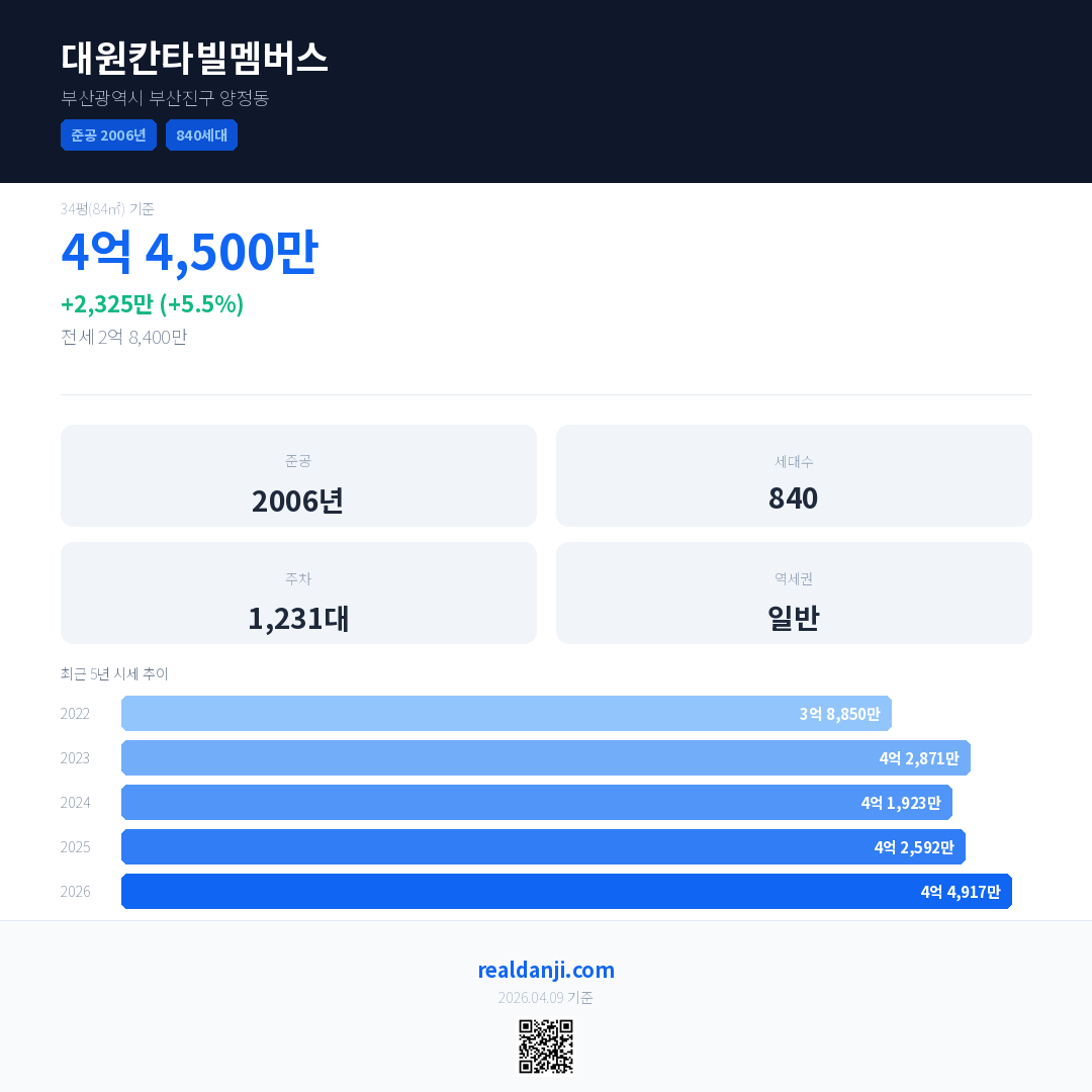 대원칸타빌멤버스 국민평형 기준 2026년 평균 거래가는 4억 4,917만으로, 전년 대비 5.5% 상승 했습니다.