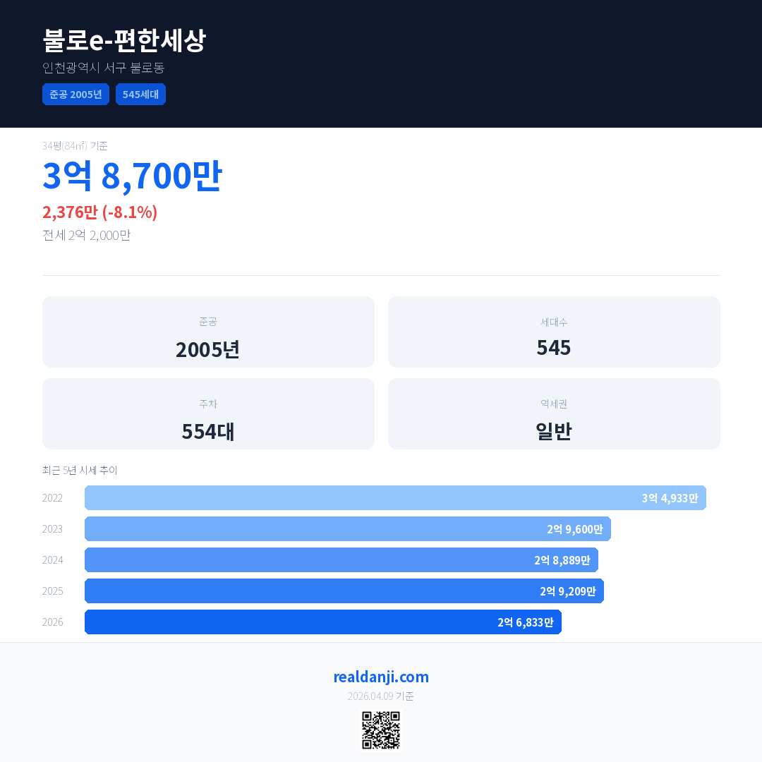 불로e-편한세상 국민평형 기준 2026년 평균 거래가는 2억 6,833만으로, 전년 대비 8.1% 하락 했습니다.