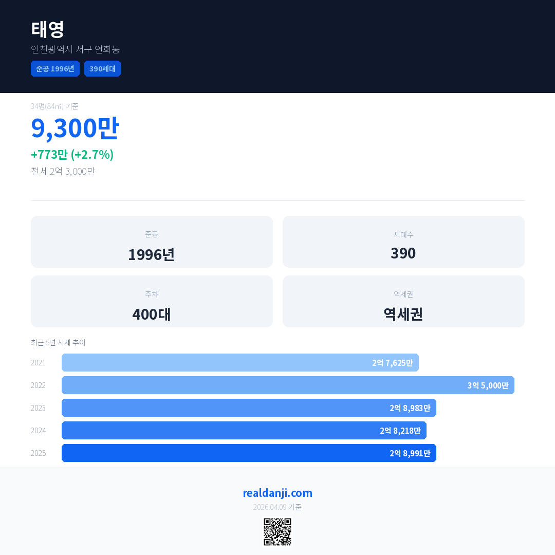 태영은(는) 1996년에 준공되었으며, 현재 30년차입니다. 총 390세대 규모입니다.