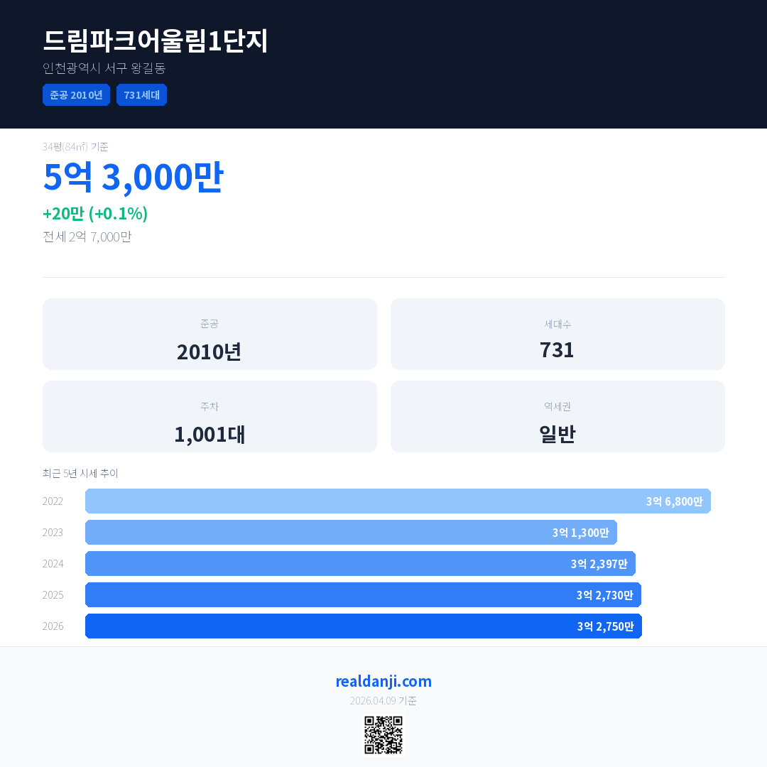 드림파크어울림1단지 최근 거래가는 5억 3,000만입니다. (2026-03)