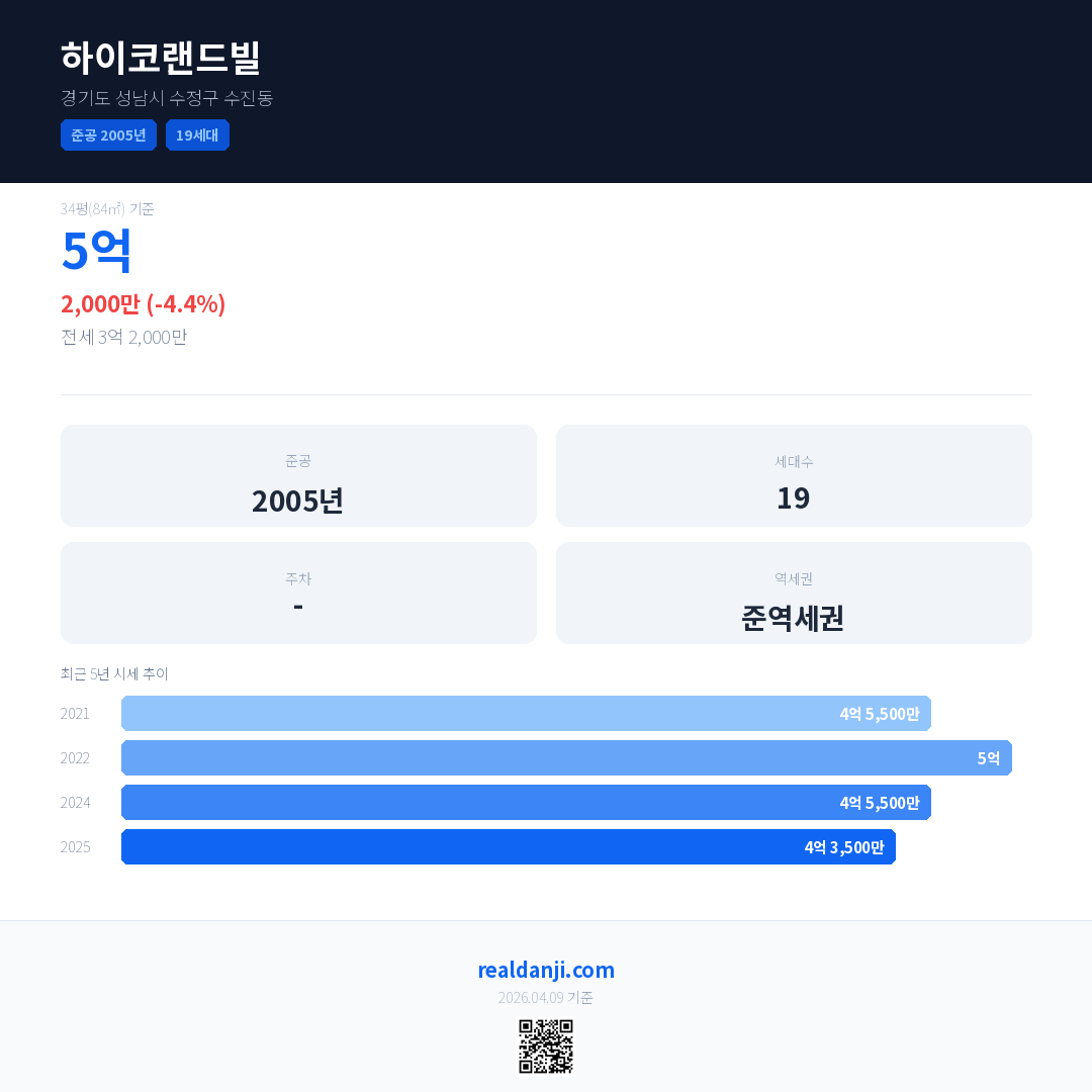 하이코랜드빌 최근 거래가는 5억입니다. (2025-05)