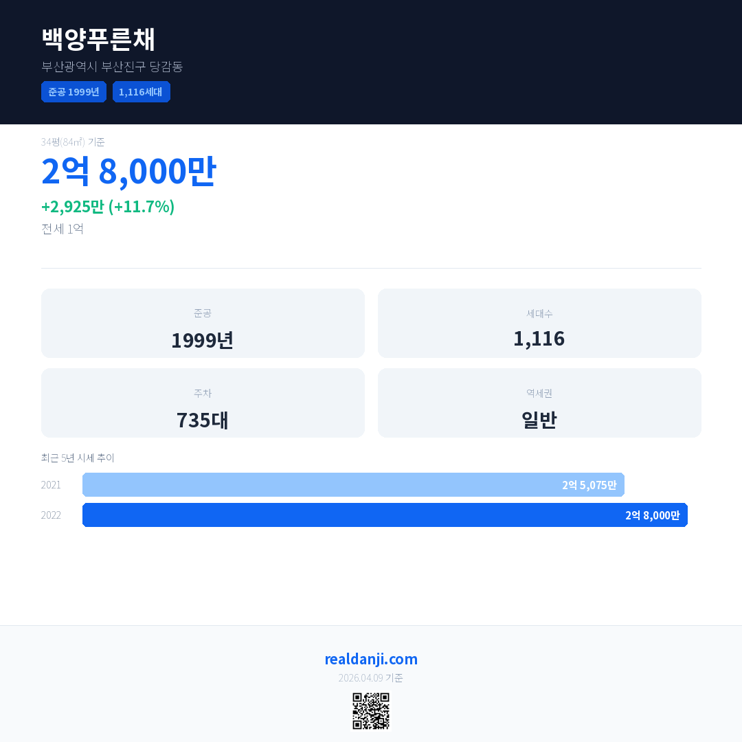 백양푸른채은(는) 1999년에 준공되었으며, 현재 27년차입니다. 총 1,116세대 규모입니다.