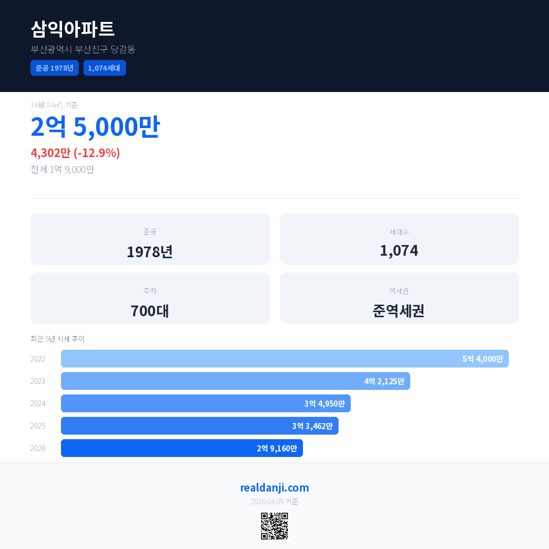 삼익아파트 국민평형 기준 2026년 평균 거래가는 2억 9,160만으로, 전년 대비 12.9% 하락 했습니다.