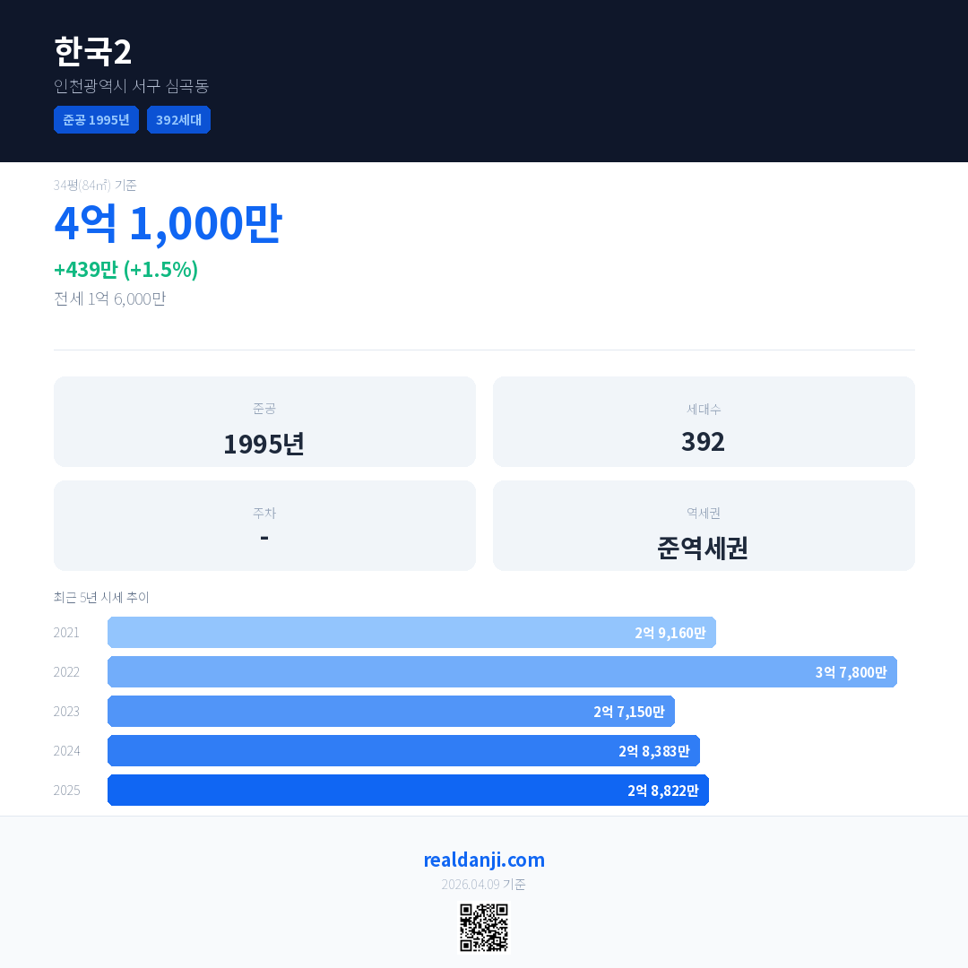 한국2 최근 거래가는 4억 1,000만입니다. (2025-11)