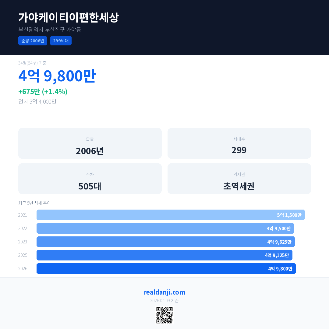 가야케이티이편한세상 국민평형 기준 2026년 평균 거래가는 4억 9,800만으로, 전년 대비 1.4% 상승 했습니다.