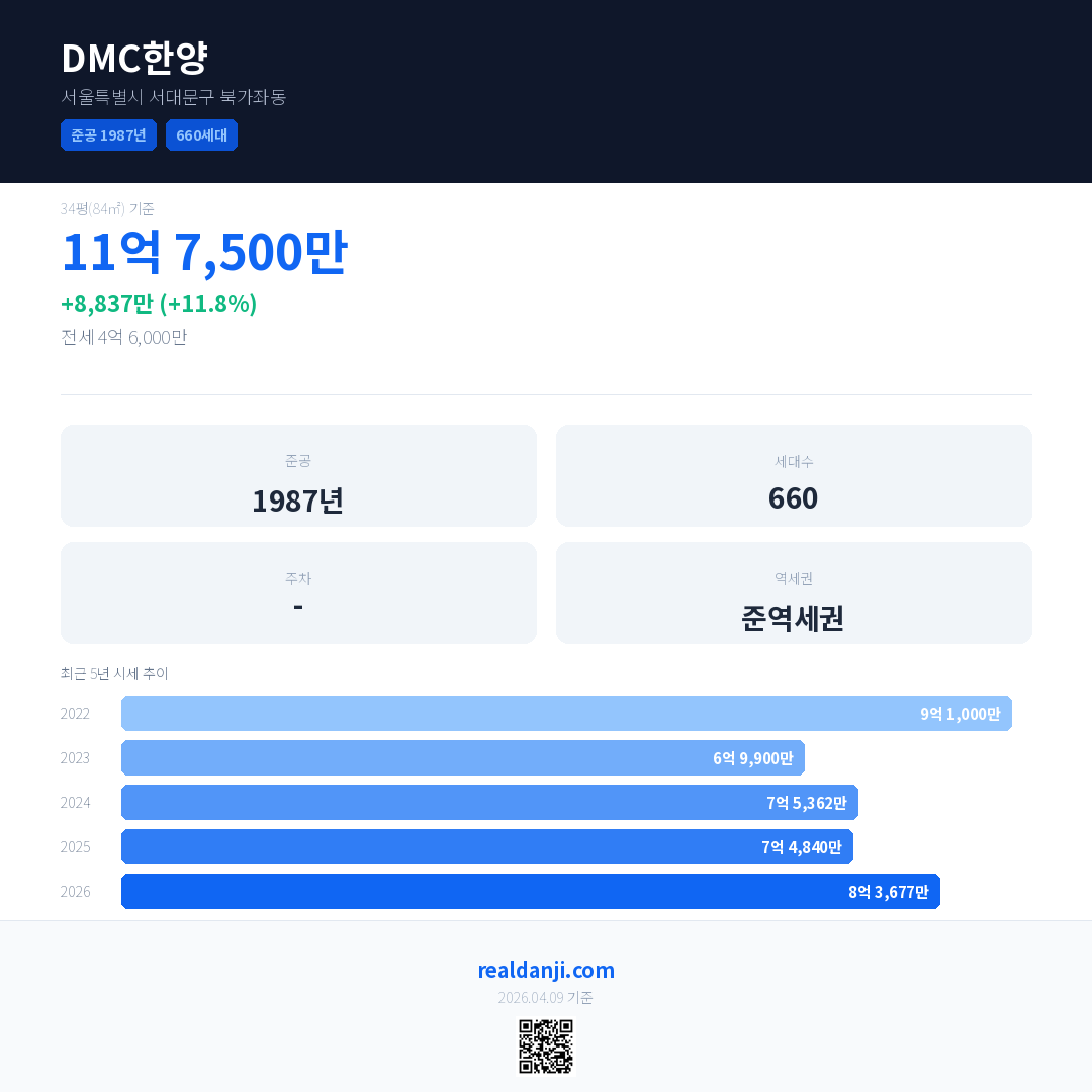 DMC한양 최근 거래가는 11억 7,500만입니다. (2026-04)