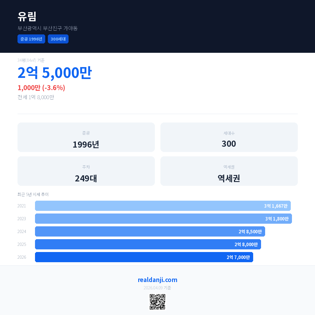 유림 국민평형 기준 2026년 평균 거래가는 2억 7,000만으로, 전년 대비 3.6% 하락 했습니다.