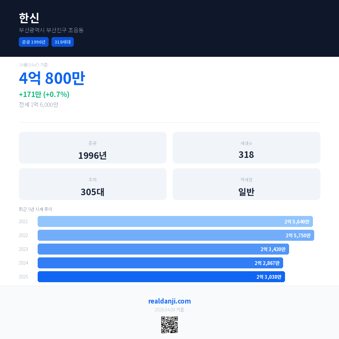 한신 최근 거래가는 4억 800만입니다. (2025-12)