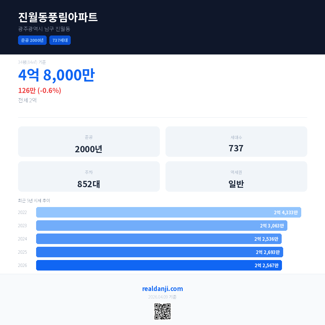 진월동풍림아파트 최근 거래가는 4억 8,000만입니다. (2026-03)