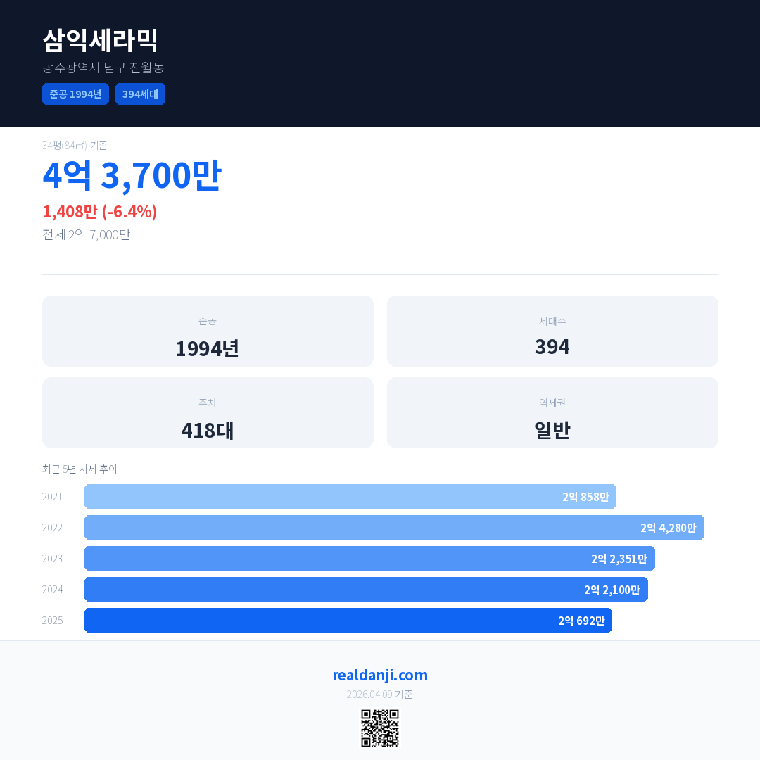 삼익세라믹은(는) 1994년에 준공되었으며, 현재 32년차입니다. 총 394세대 규모입니다.