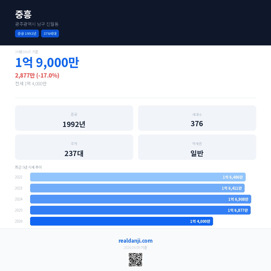 중흥 국민평형 기준 2026년 평균 거래가는 1억 4,000만으로, 전년 대비 17.0% 하락 했습니다.