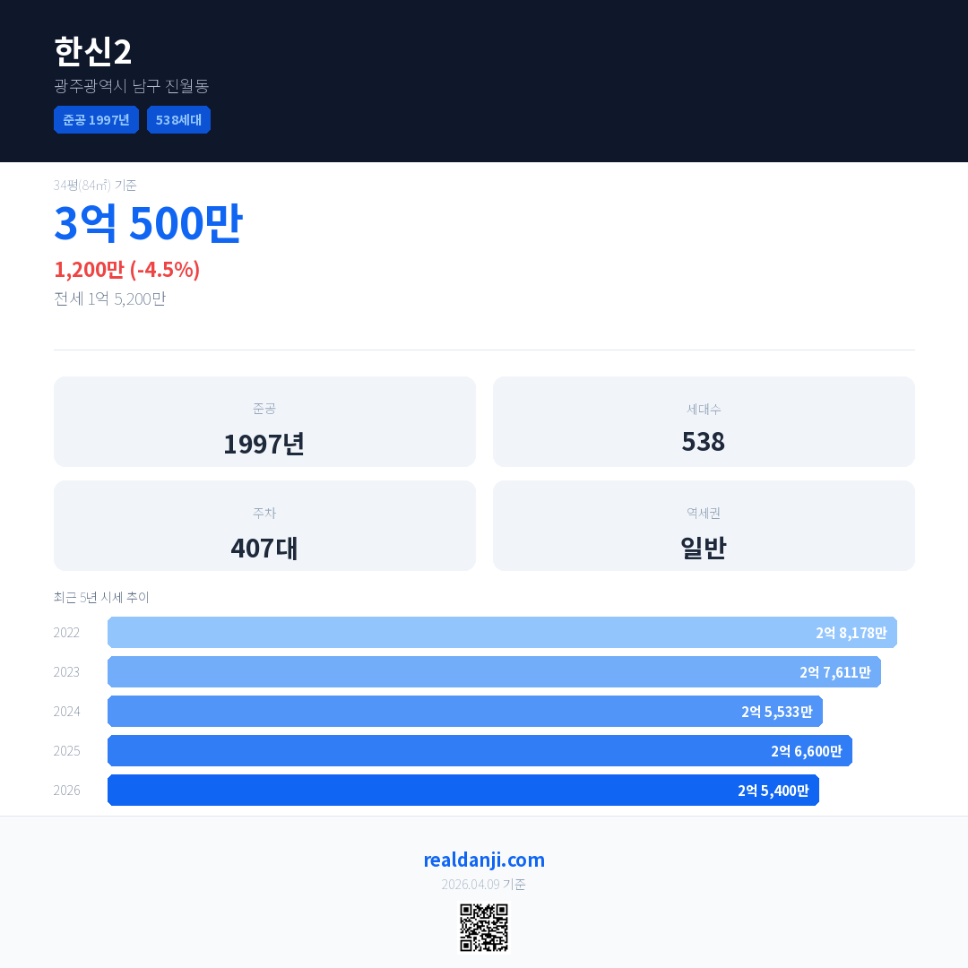 한신2 최근 거래가는 3억 500만입니다. (2026-04)