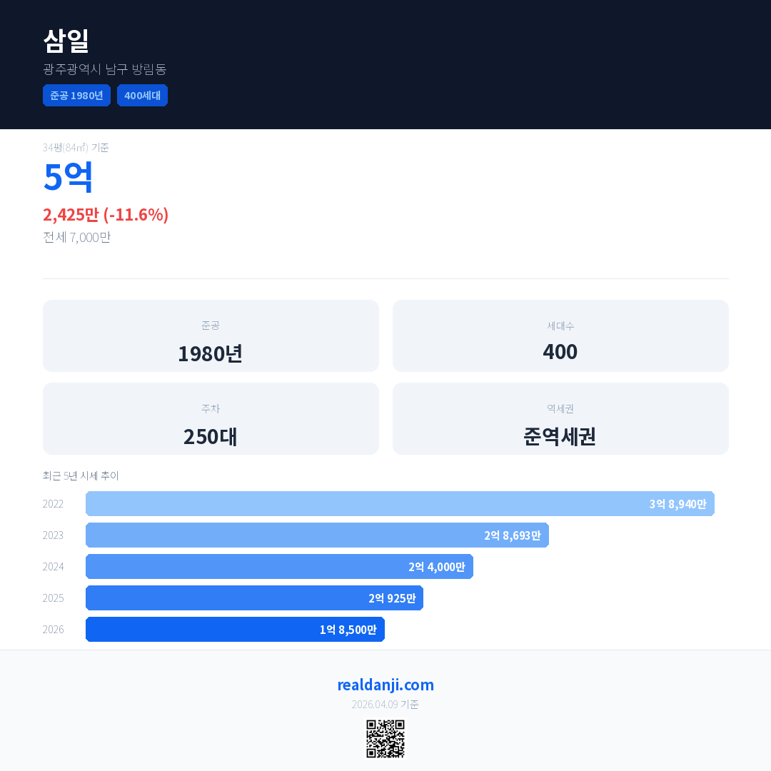 삼일 최근 거래가는 5억입니다. (2026-03)