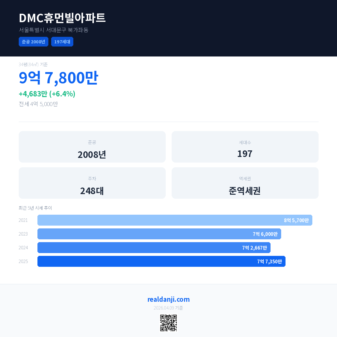 DMC휴먼빌아파트은(는) 2008년에 준공되었으며, 현재 18년차입니다. 총 197세대 규모입니다.