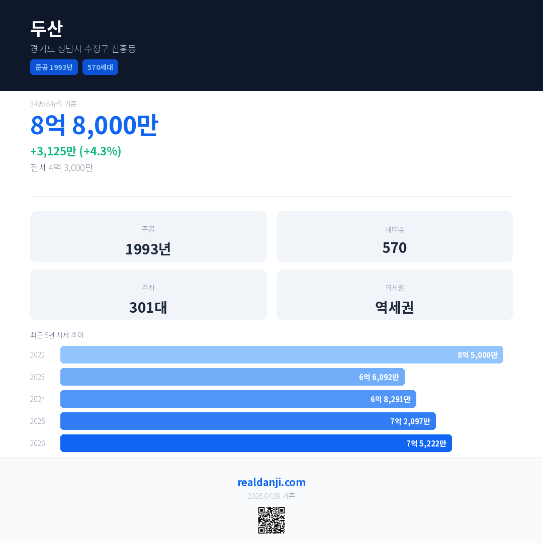 두산 국민평형 기준 2026년 평균 거래가는 7억 5,222만으로, 전년 대비 4.3% 상승 했습니다.