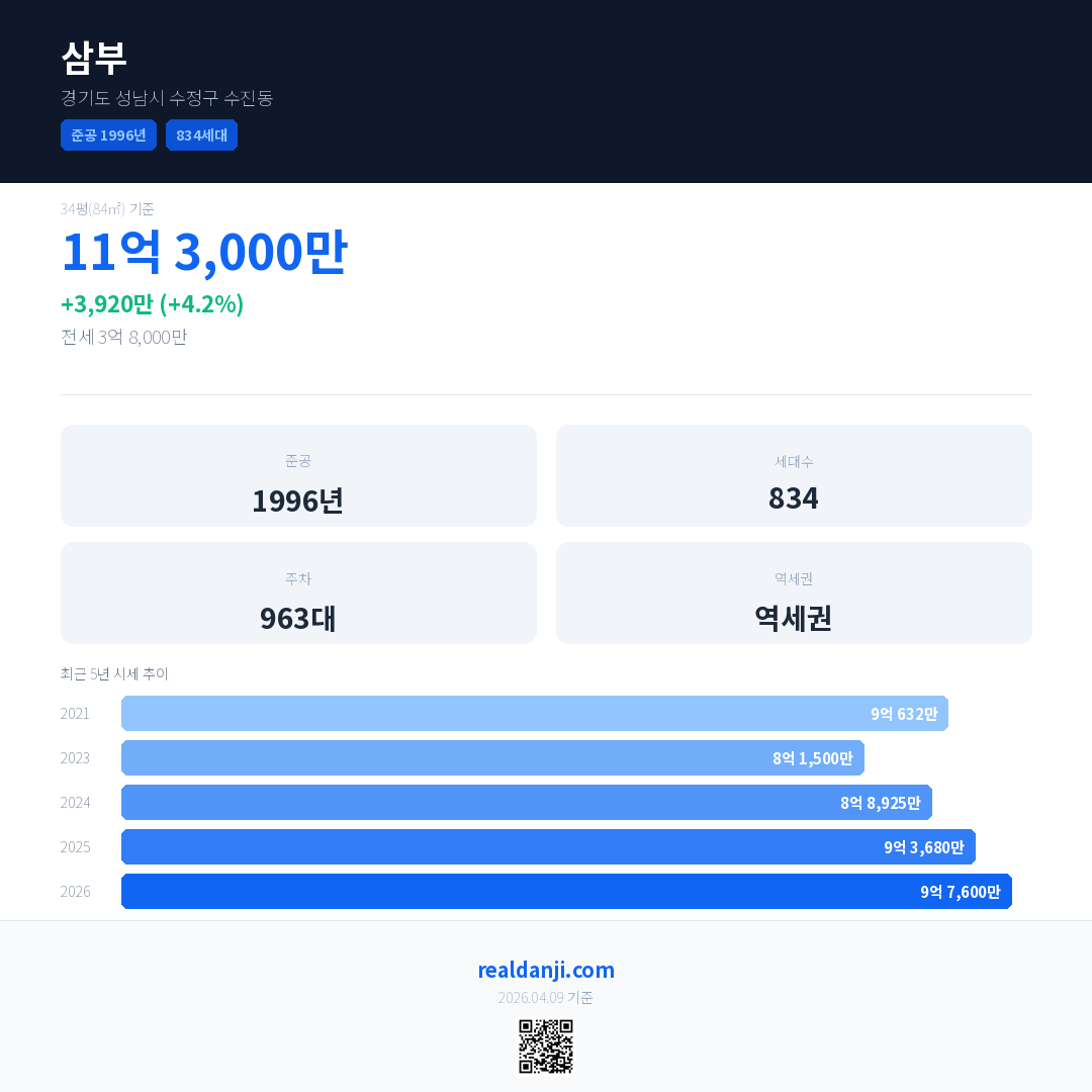 삼부 국민평형 기준 2026년 평균 거래가는 9억 7,600만으로, 전년 대비 4.2% 상승 했습니다.