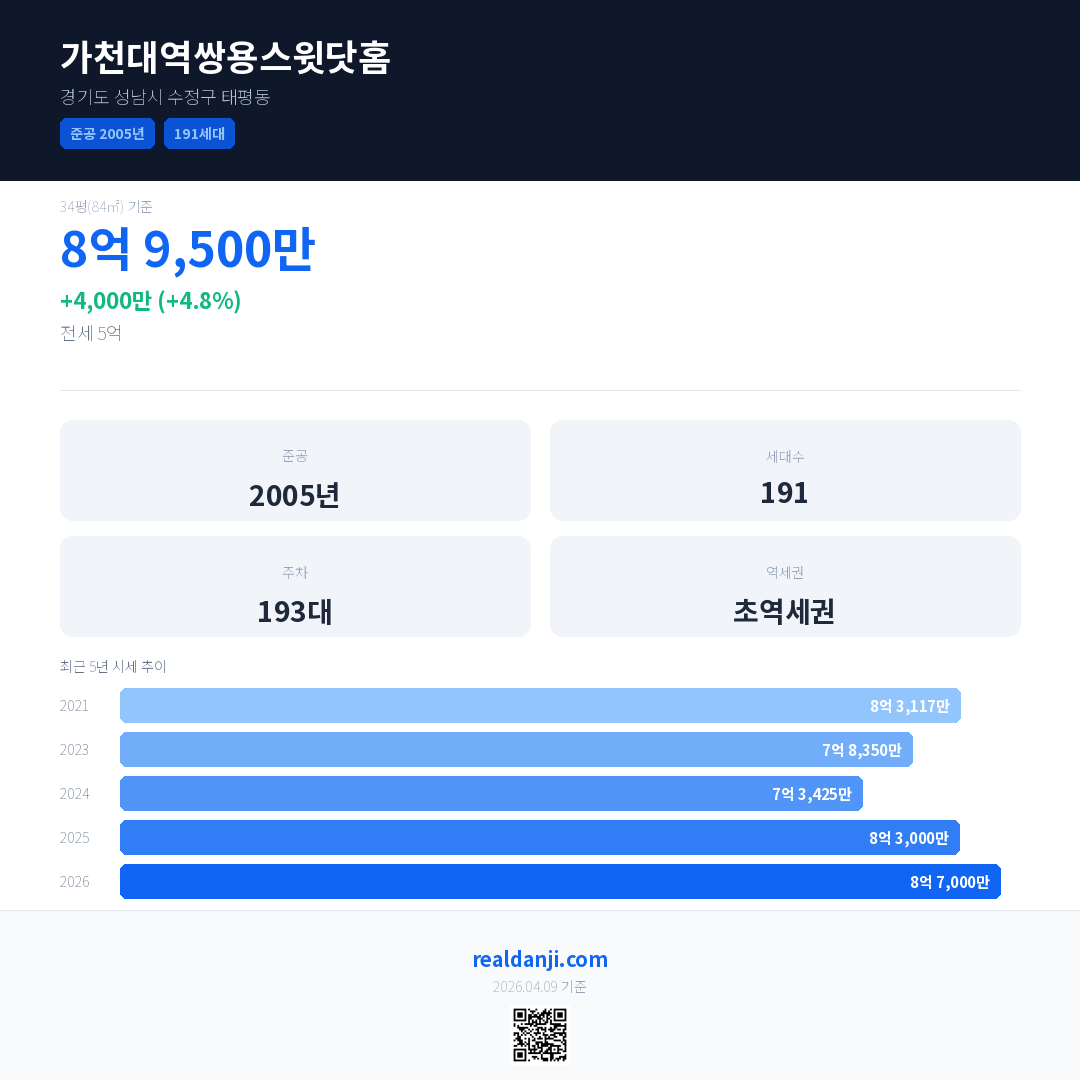 가천대역쌍용스윗닷홈 국민평형 기준 2026년 평균 거래가는 8억 7,000만으로, 전년 대비 4.8% 상승 했습니다.