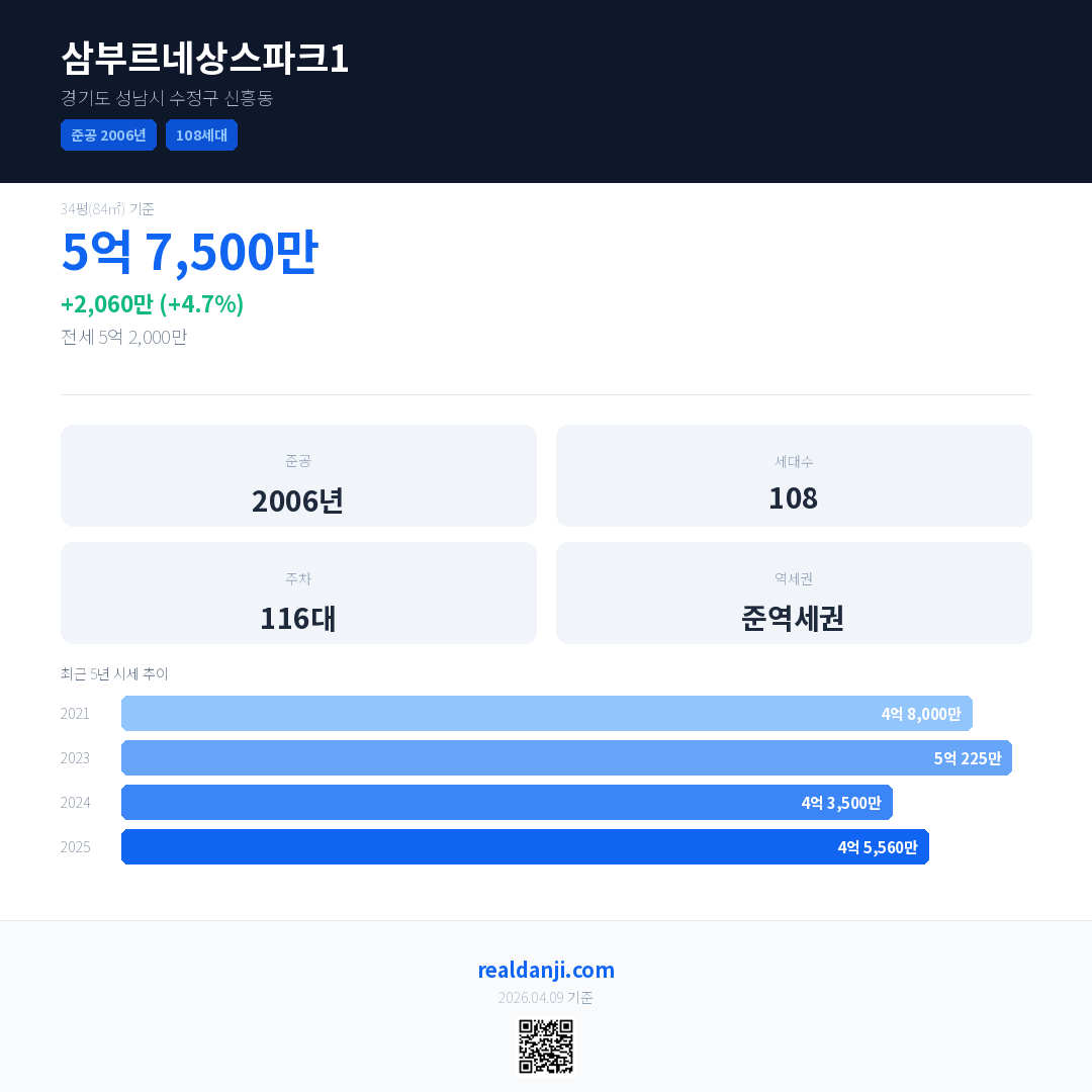 삼부르네상스파크1 국민평형 기준 2025년 평균 거래가는 4억 5,560만으로, 전년 대비 4.7% 상승 했습니다.