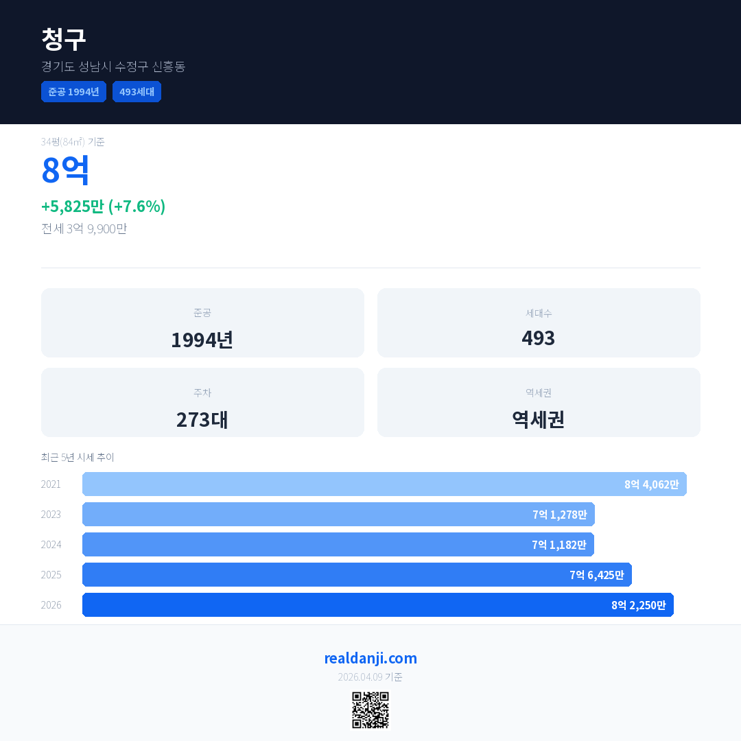 청구 국민평형 기준 2026년 평균 거래가는 8억 2,250만으로, 전년 대비 7.6% 상승 했습니다.