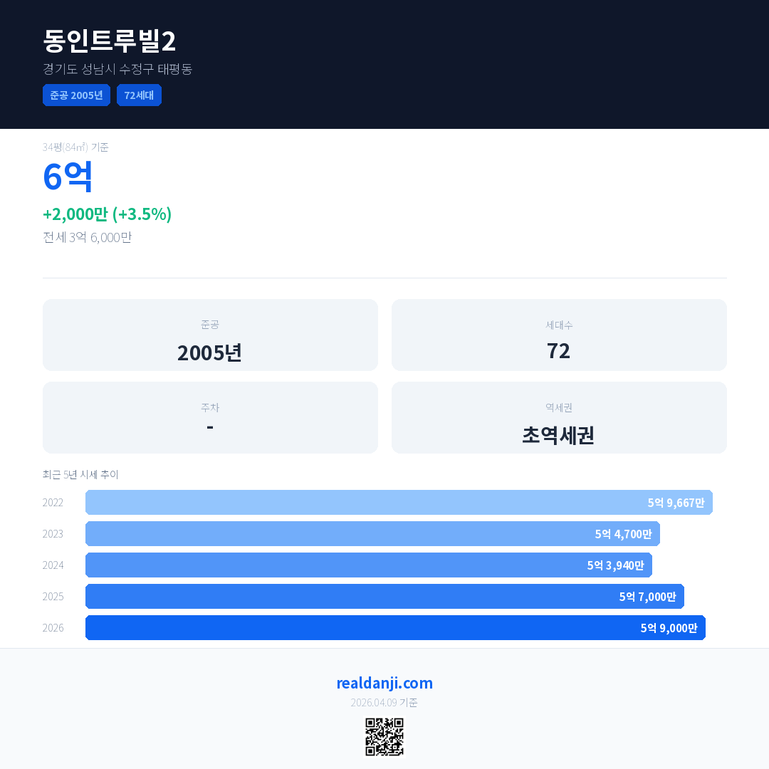 동인트루빌2 국민평형 기준 2026년 평균 거래가는 5억 9,000만으로, 전년 대비 3.5% 상승 했습니다.