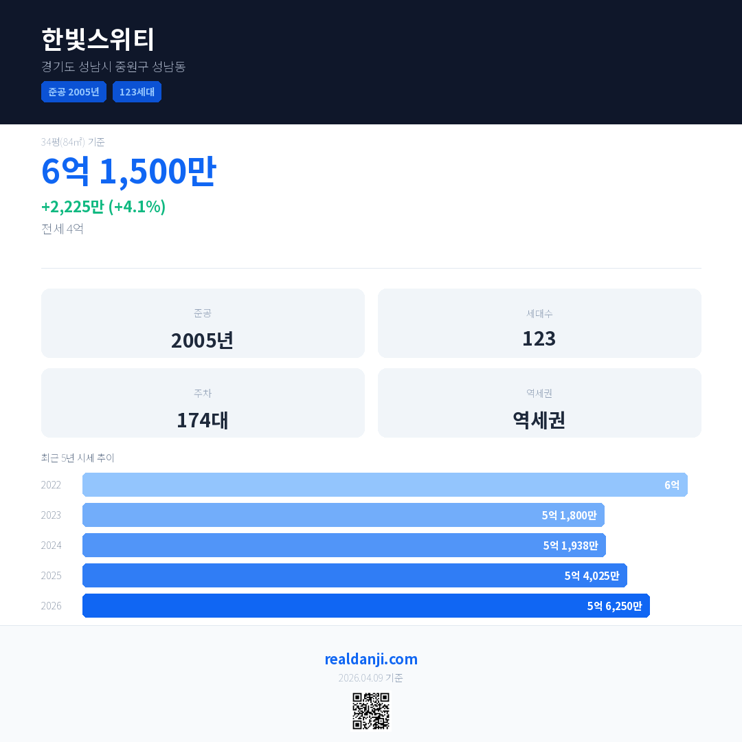 한빛스위티 국민평형 기준 2026년 평균 거래가는 5억 6,250만으로, 전년 대비 4.1% 상승 했습니다.
