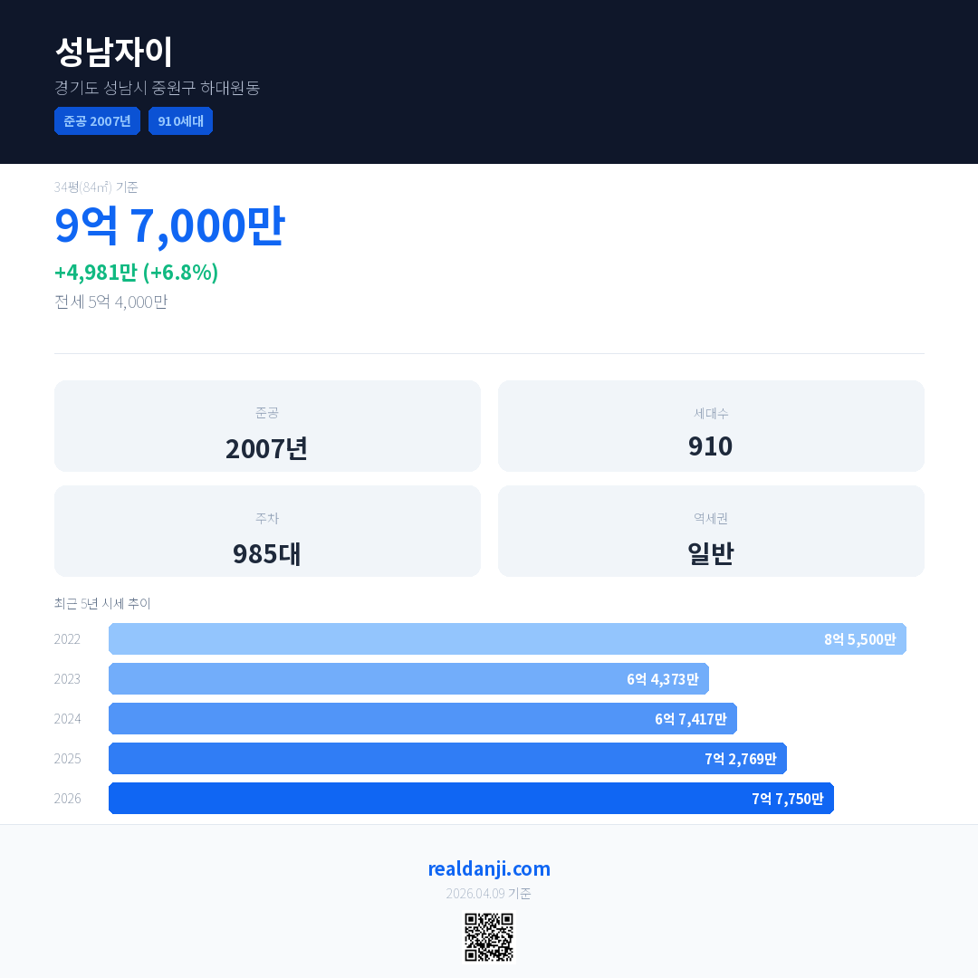 성남자이 최근 거래가는 9억 7,000만입니다. (2026-03)