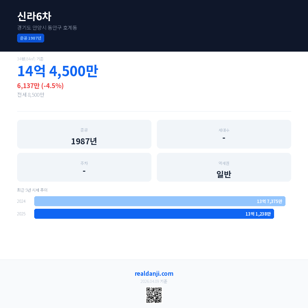 신라6차 국민평형 기준 2025년 평균 거래가는 13억 1,238만으로, 전년 대비 4.5% 하락 했습니다.