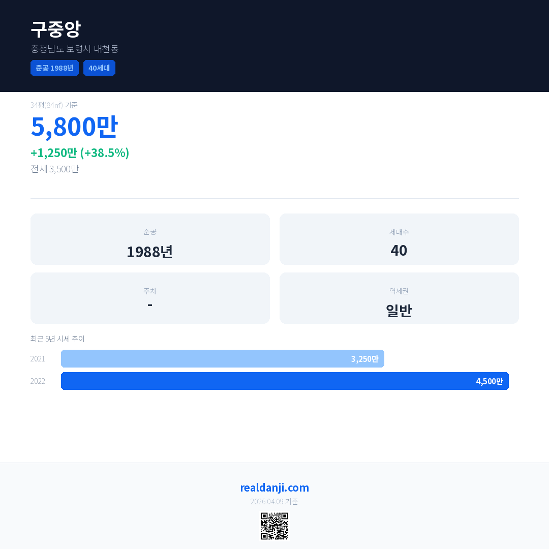 구중앙은(는) 1988년에 준공되었으며, 현재 38년차입니다. 총 40세대 규모입니다.